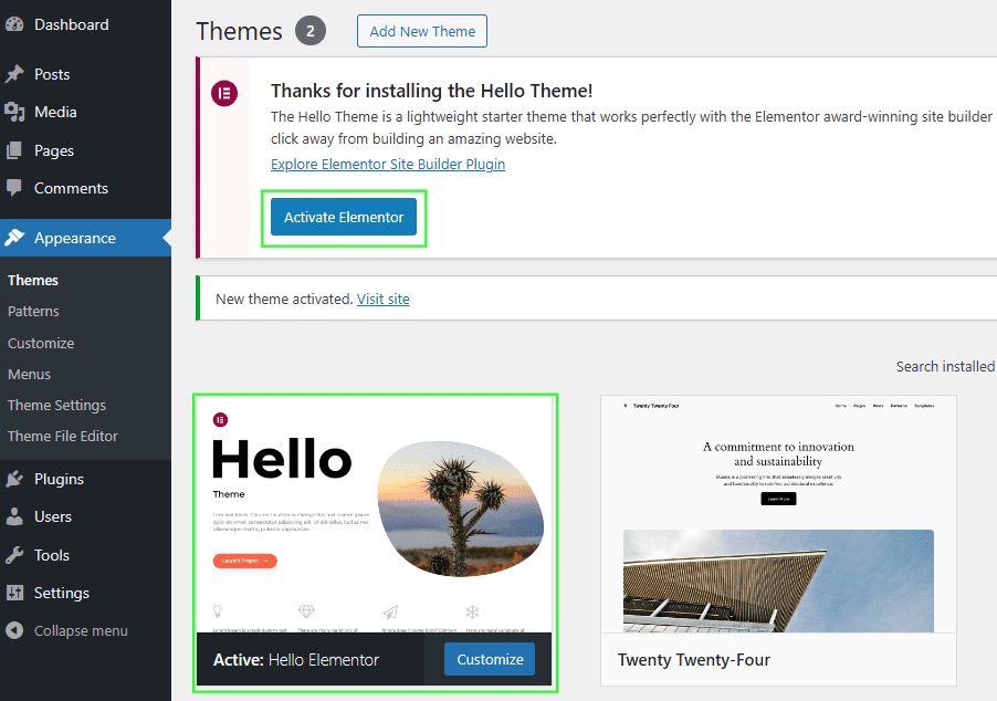 - Make sure that the “Hello Elementor” theme is installed and activated. If not, you can search for it and install it from the WordPress repository.