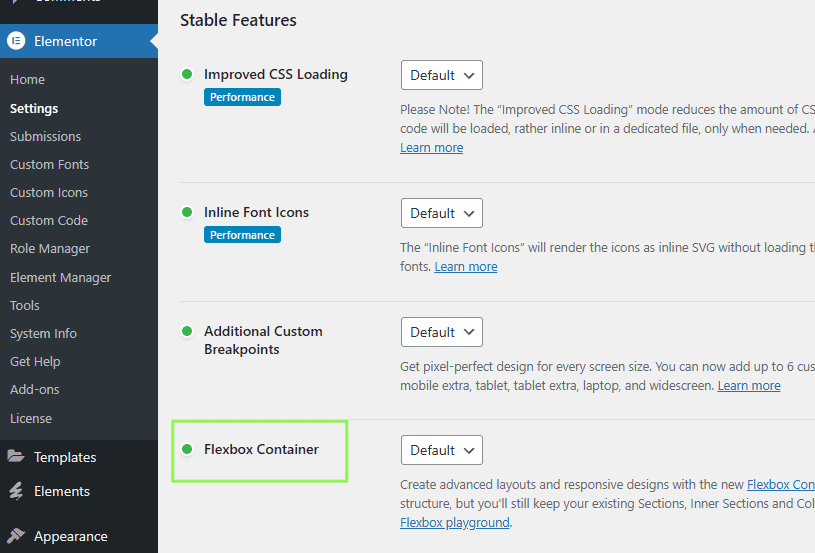 - In your WordPress dashboard, go to Elementor > Settings.