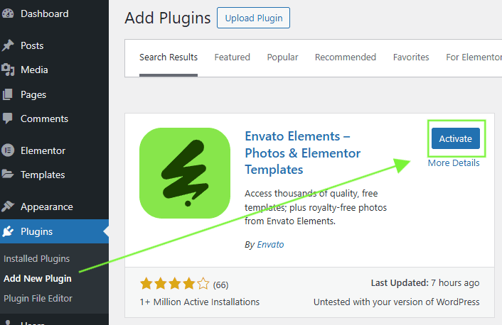 6. Go to Plugins > Add New and search for “Envato” and Install and Activate the Envato Elements – Photos & Elementor Templates plugin