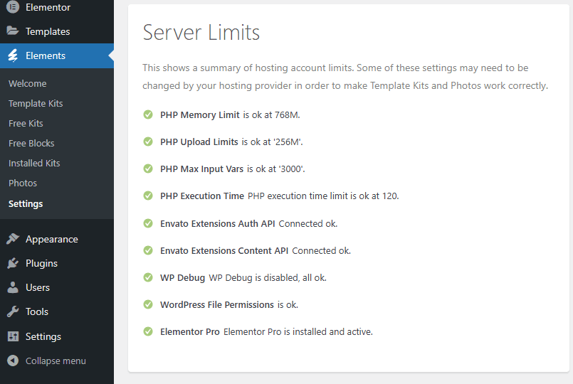 8. Go to Elements > Settings and ensure the Server Limits have green checks. Any issues will be noted and should be directed to your web host for resolution before continuing.
