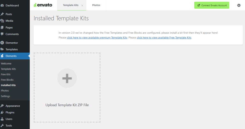 1.Go to Elements > Installed Kits and click Upload Template Kit ZIP File. Your templates should appear.